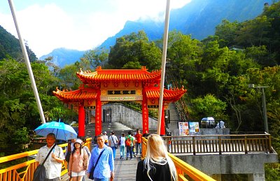 Svatyně věčného jara v národním parku Taroko je zasazena do skal nad vodopádem a slouží jako památník dělníkům, kteří zahynuli při stavbě horské silnice skrze soutěsku.