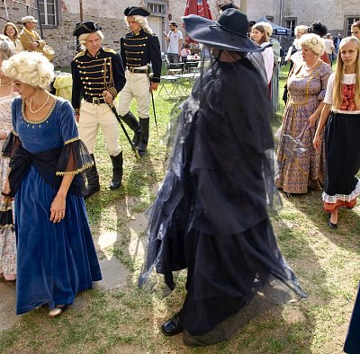 Přihlížející dav si přece jen trochu vydechne a pozoruje další příchozí. Zámečtí písaři, lovčí a lesní se smečkou loveckých psů. Ti jediní po sobě i divácích vesele ňafají. A již procházejí pážata s korunou, následovaná panským správcem. Drábové nervózně mrskají důtkami. Objevuje se panské služebnictvo - komorné a komorníci a již přichází vlajkonoš se standardou vládnoucího rodu Collalto.
