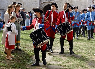 Průvod skončil a diváci, kteří jej doprovázeli až do zámecké zahrady, se marně dožadují vstupu na druhé zámecké nádvoří. Zatímco jim v tom poslední zbrojnoši brání, účastníci historického průvodu si mohou konečně odpočinout a s úsměvem si říci – Máme to za sebou.