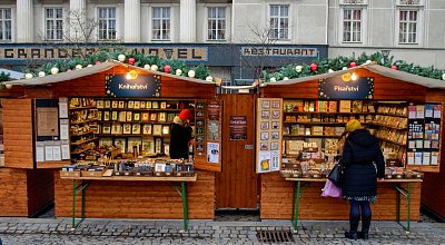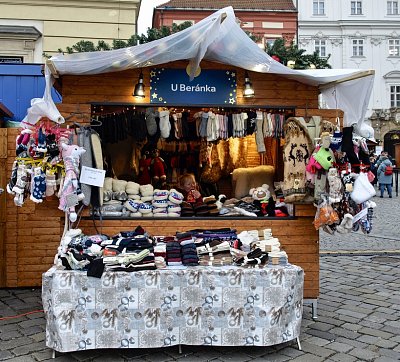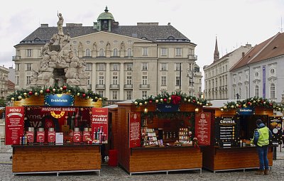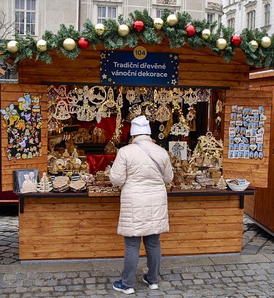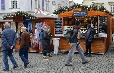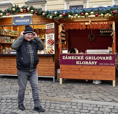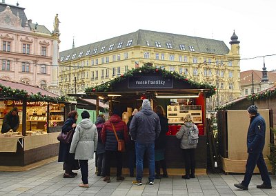 V okolních ulicích si zájemci mohli vybrat z široké nabídky svátečních vazeb, adventních věnců, jmelí, pozlacených nebo postříbřených větviček, vánočních svícnů a dalšího zboží. Vpravo další z fotopointů s brněnským symbolem "krokouše" :-)