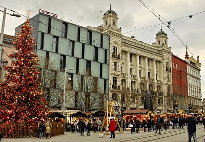 Prohlídku jsme zahájili na Zelném trhu. Poblíž kašny Parnas je postaven nádherný vysoký vánoční strom s betlémem